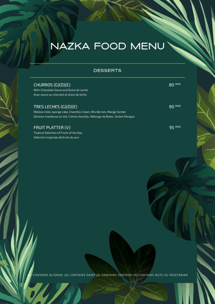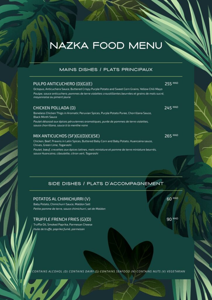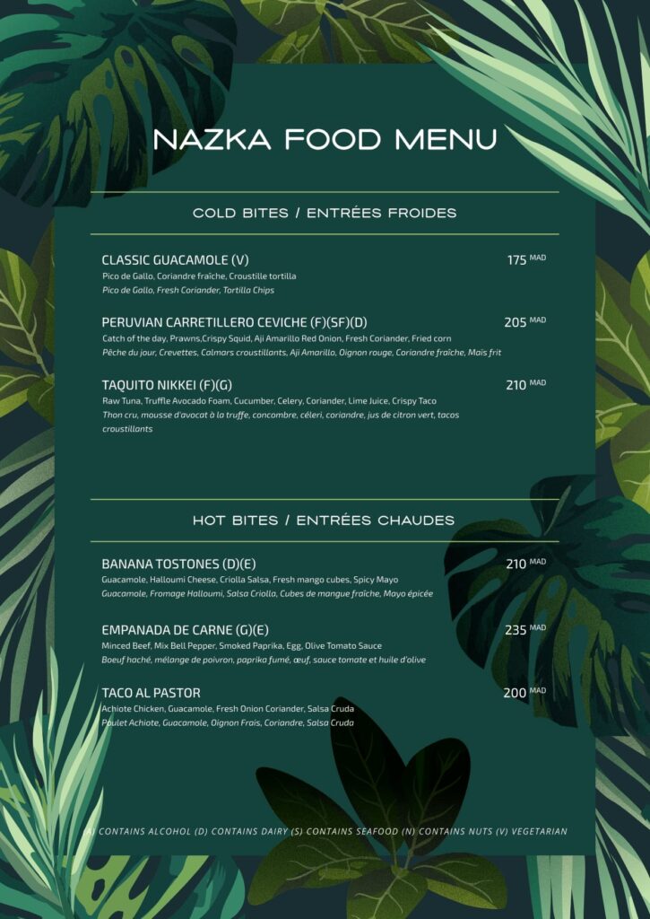 Nazka’s gastronomy is an homage to the rich and diverse flavors of Latin America, reimagined for the contemporary palate. Our chef invites you on a culinary odyssey, fusing traditional techniques with a modern sensibility to create dishes that are both authentic and innovative. Our menu is a vibrant tapestry of shared plates and signature dishes. Indulge in our exquisite Tiraditos and Ceviches, savor the smoky richness of our grilled meats, or dive into our delicately prepared seafood. Each ingredient is selected for its freshness and quality, promising a dining experience that is as unforgettable as the view.